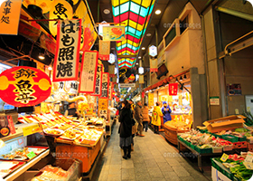 Nishiki Koji is a narrow, five block long shopping street lined by more than one hundred shops and restaurants. Known as “Kyoto’s Kitchen”, this lively retail market specializes in all things food related, like fresh seafood, produce, knives and cookware, and is a great place to find seasonal foods and Kyoto specialties, such as Japanese sweets, pickles, dried seafood and sushi.