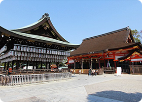 Yasaka Shrine, also known as the Gion Shrine, was built over 1350 years ago and is one of the most famous shrines in Kyoto. The shrine’s main hall combines the honden (inner sanctuary) and haiden (offering hall) into a single building.